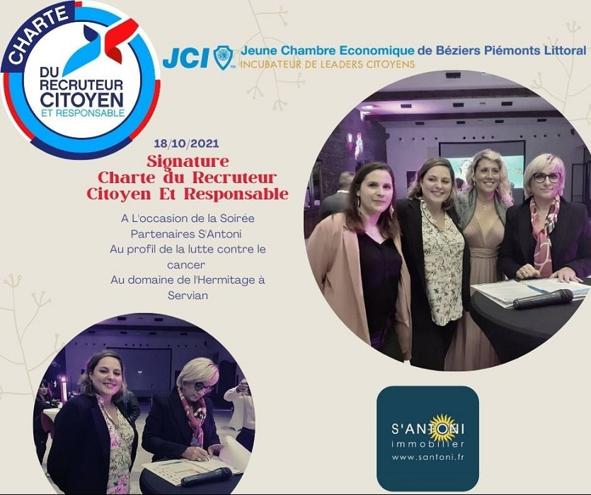 Nous avons aussi profité de ce moment pour signer la charte du Recruteur Citoyen avec la JCE de Béziers – Jeune Chambre Economique de Béziers Piémonts Littoral, en compagnie de sa présidence Mélanie SEGHIRI et Marc PASTOR.